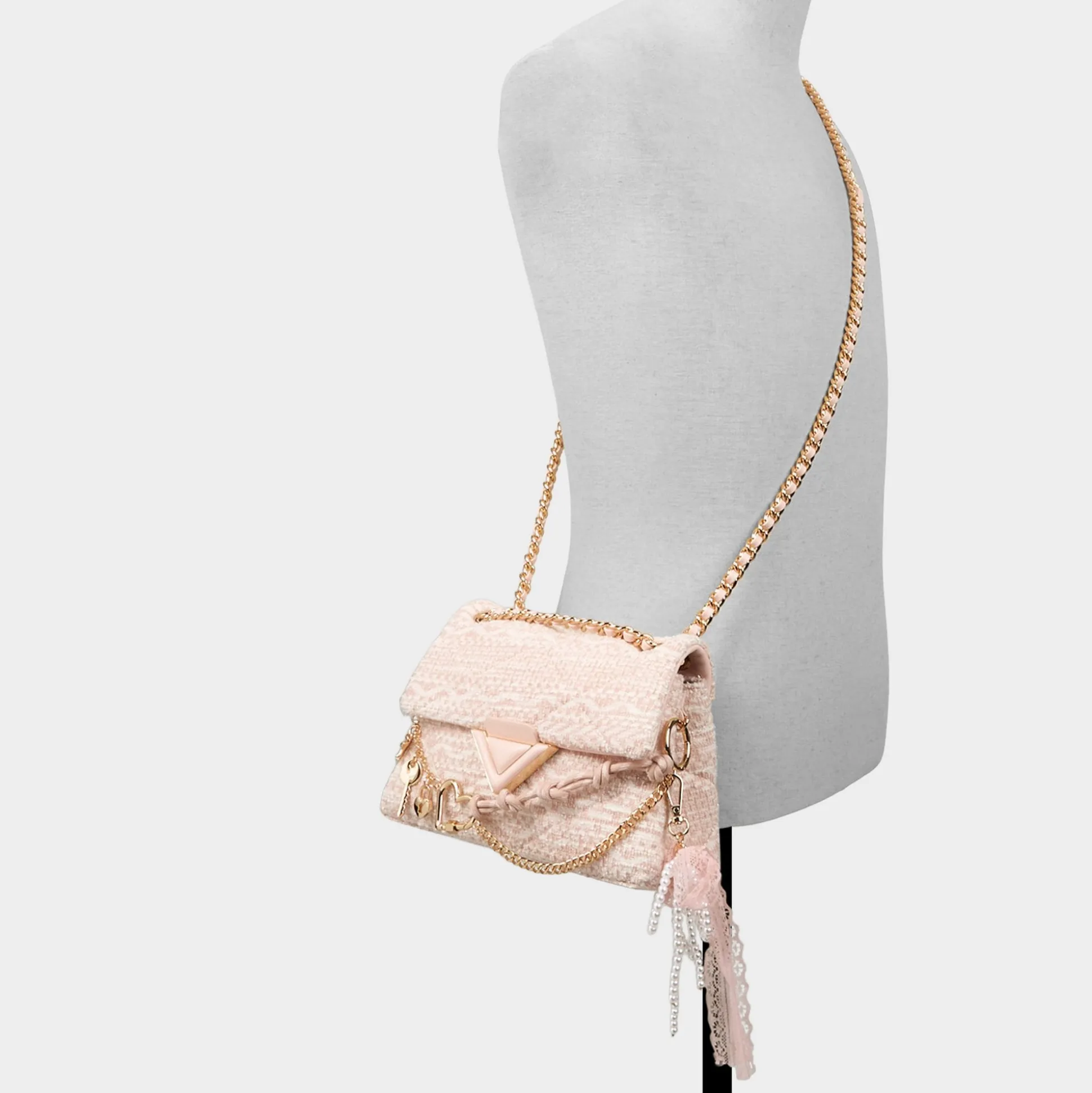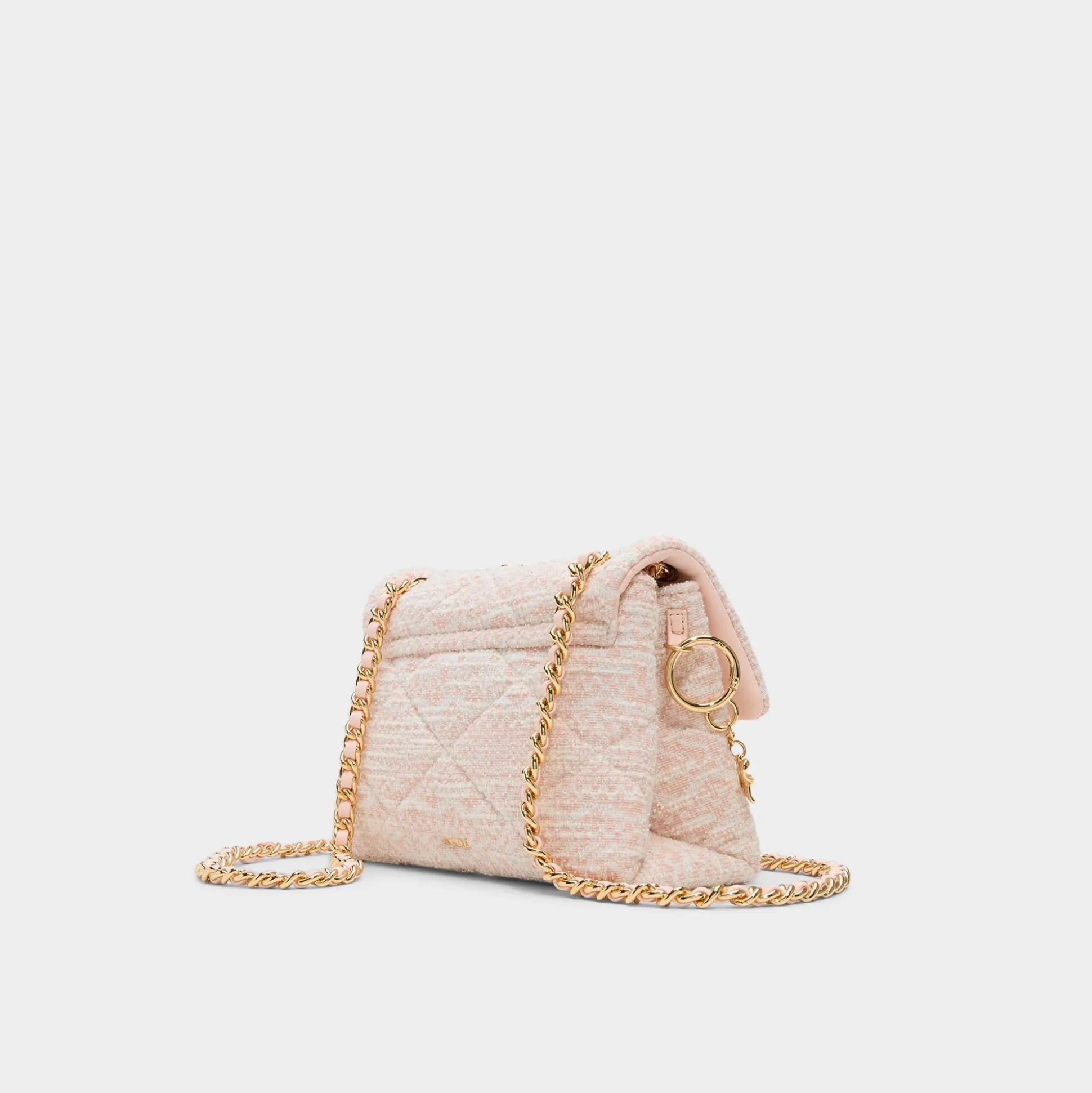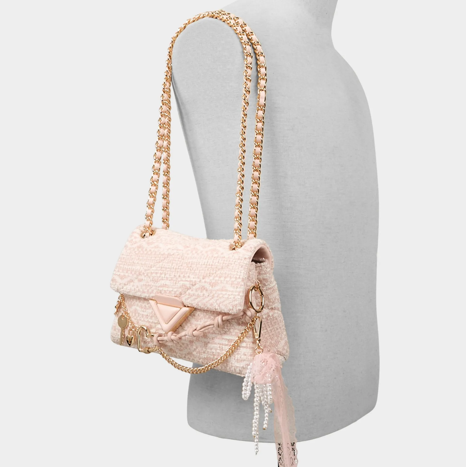 Blush tweed quilting wraps this mini shoulder bag in texture-rich charm, crowned by a gold-tone charm chain and a lacy bow you can untie to swap the vibe from coffee runs to brunch dates. Sling it with a pastel blazer for coffee runs or tuck it under a silky slip for rooftop sunsets to finish the look.