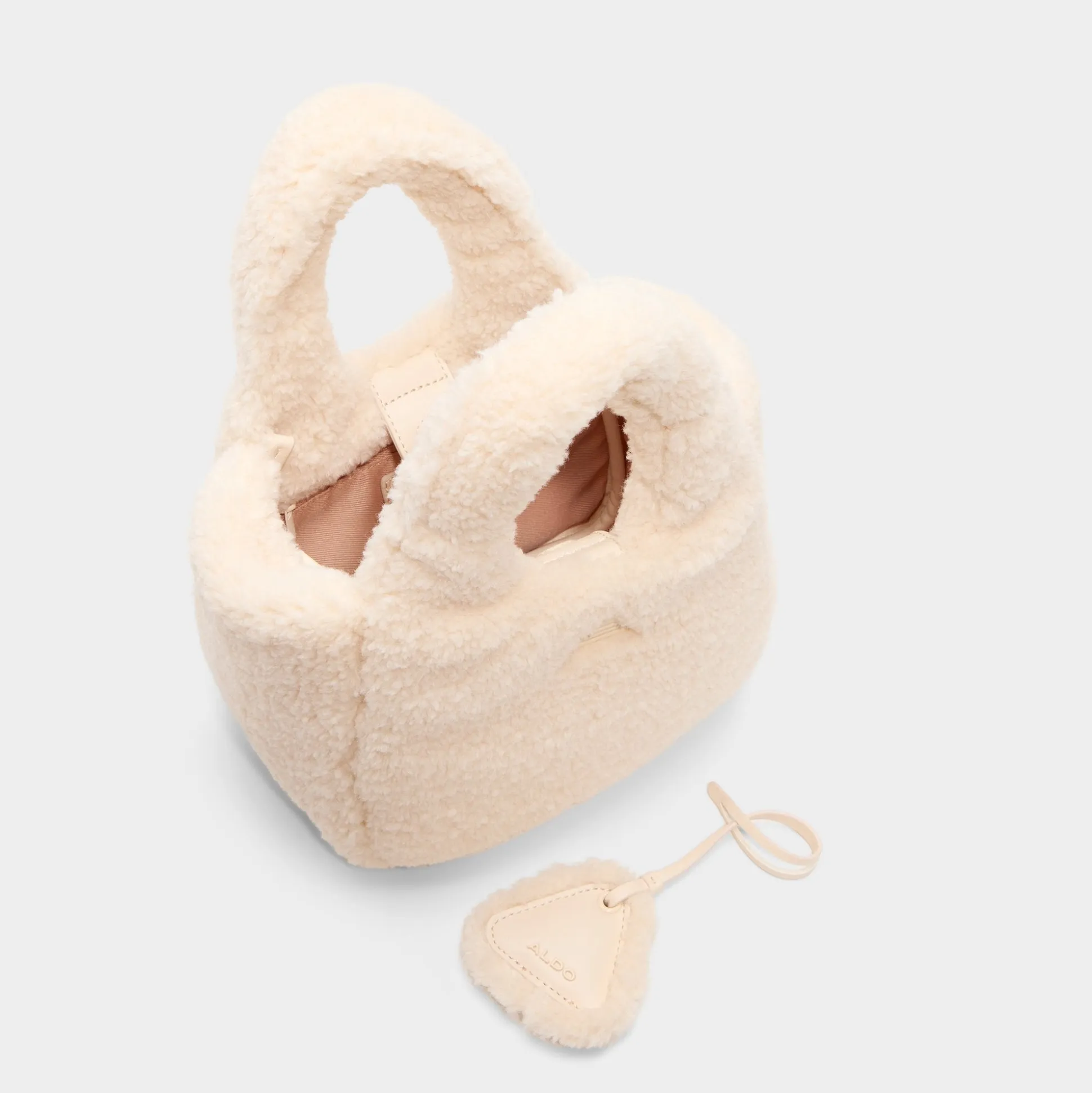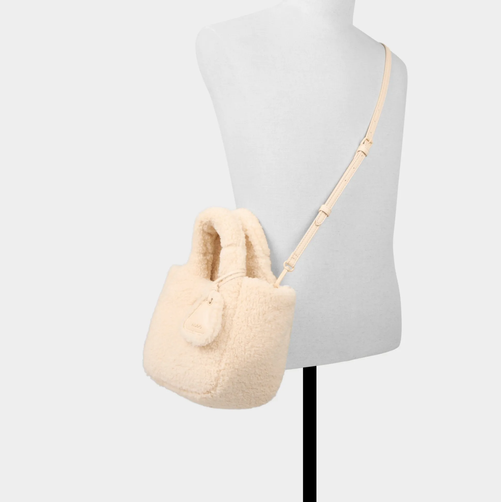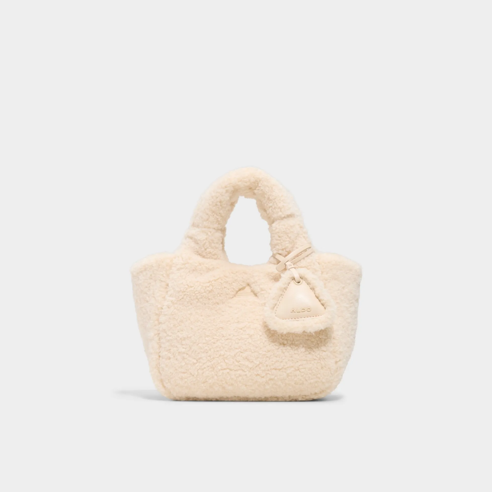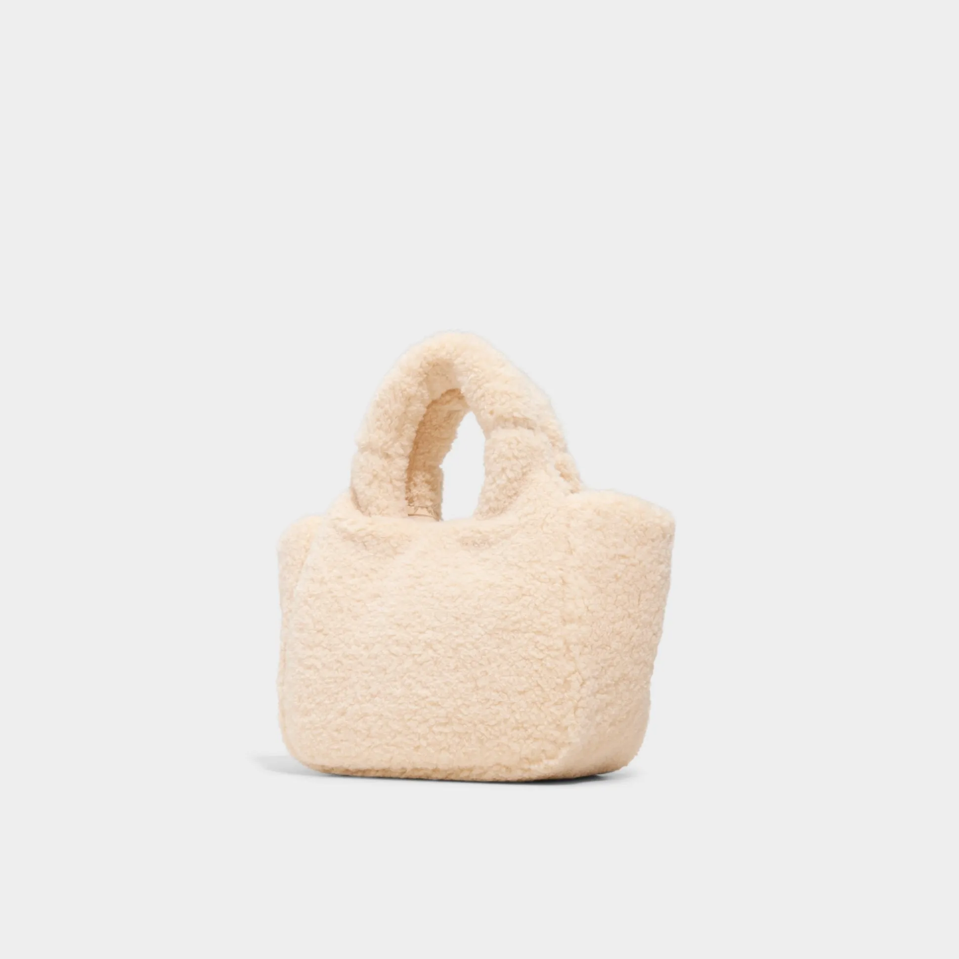 Cloud-soft sherpa envelopes this mini tote, with padded beige handles and a micro-pouch that keeps essentials close at hand, turning every city errand into a warm, hands-free moment you’ll want to repeat. Carry it with a chunky knit and cuffed jeans for coffee runs, or sling it with a wool coat for cozy movie nights.
