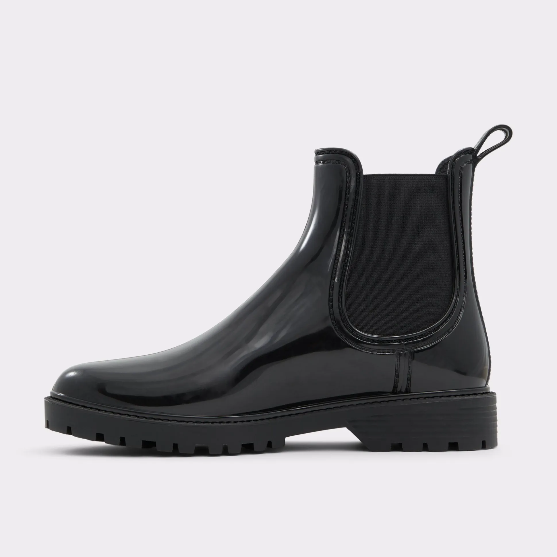 Splish splash the rainy days away in these stylish pull-on rain boots. Rendered in an iconic chelsea boot silhouette and coupled with chunky lug sole bottoms, Storm is a step up from basic wellies with a shiny finish. Warning, puddle jumping ahead!