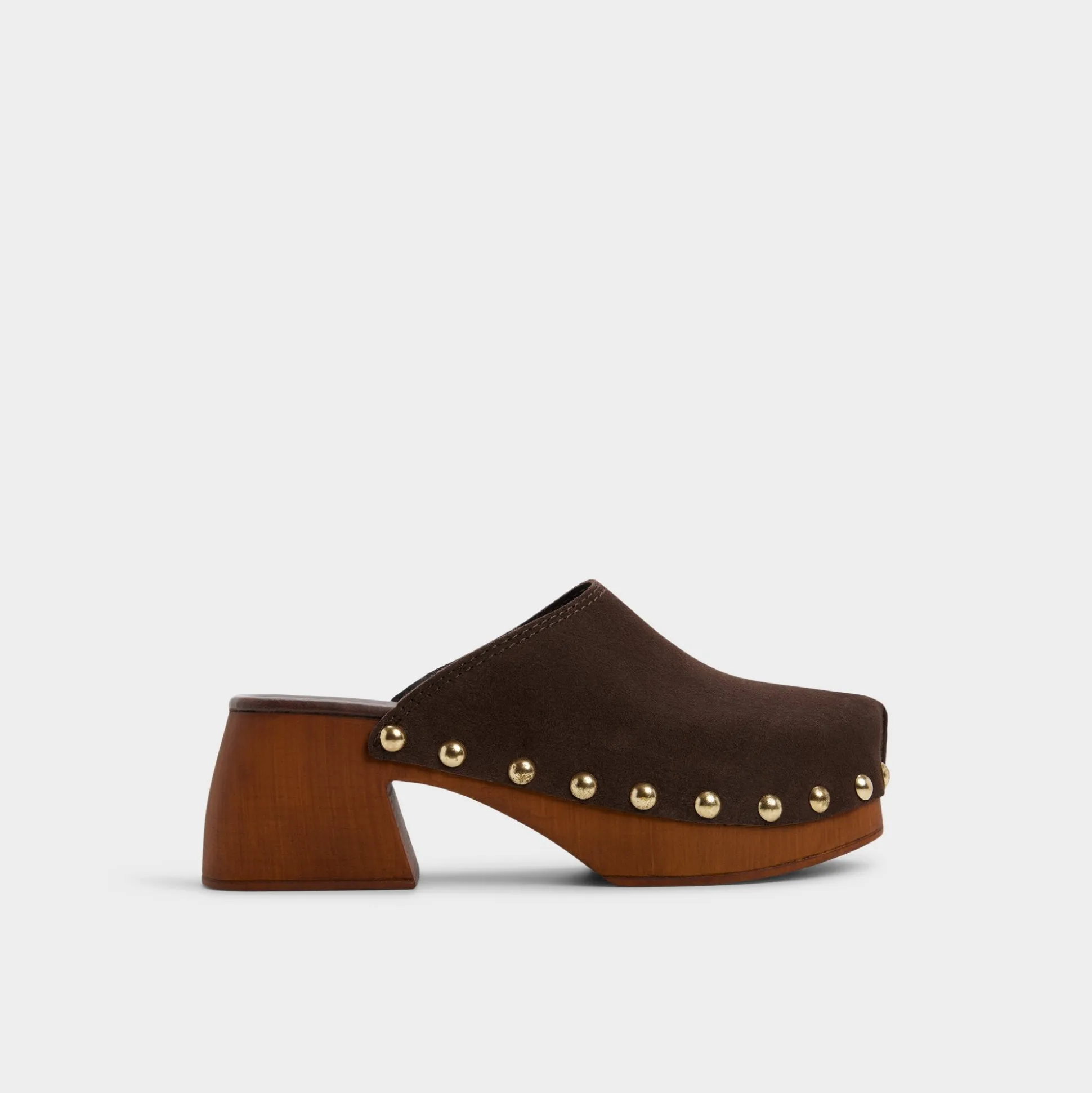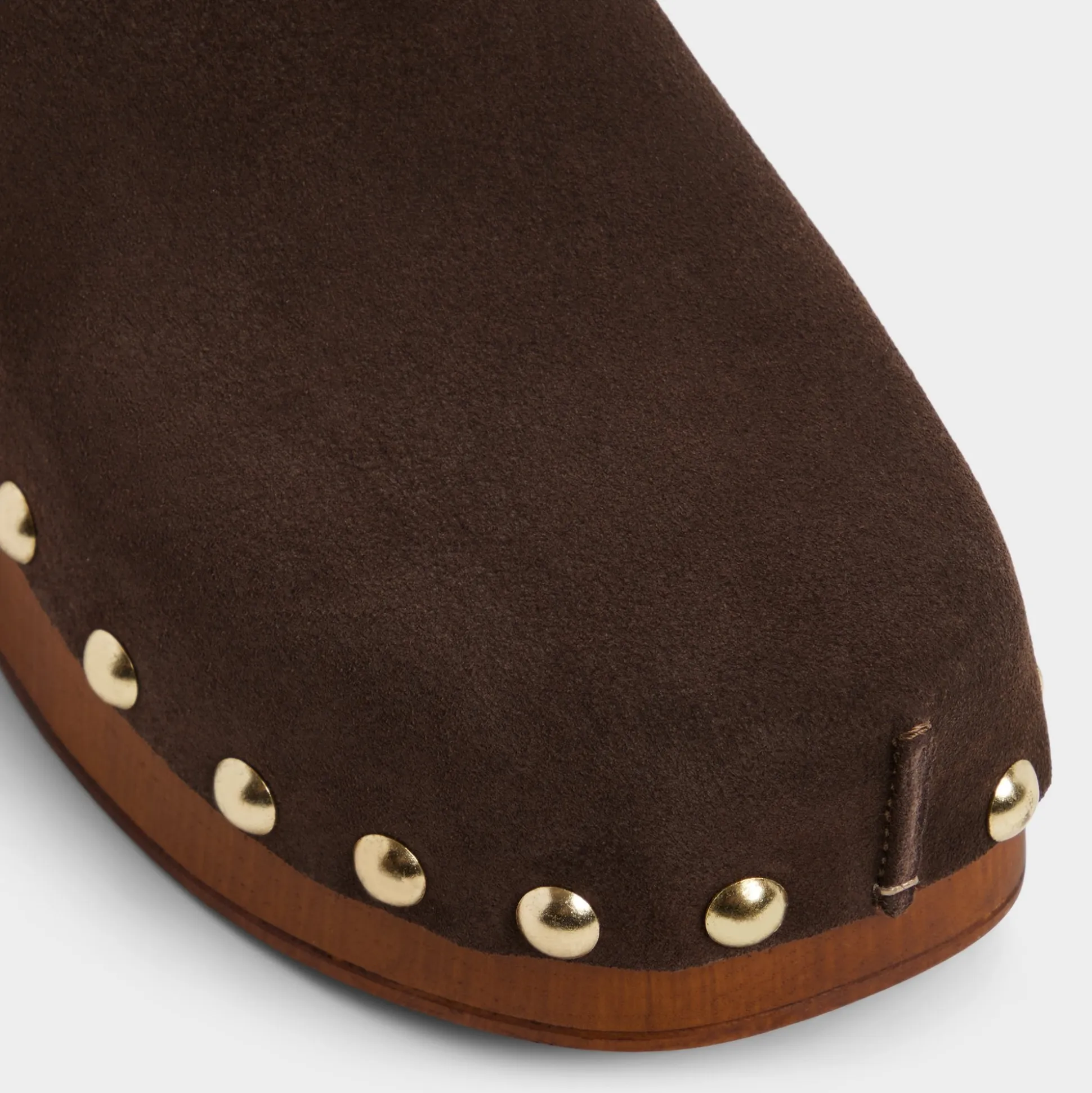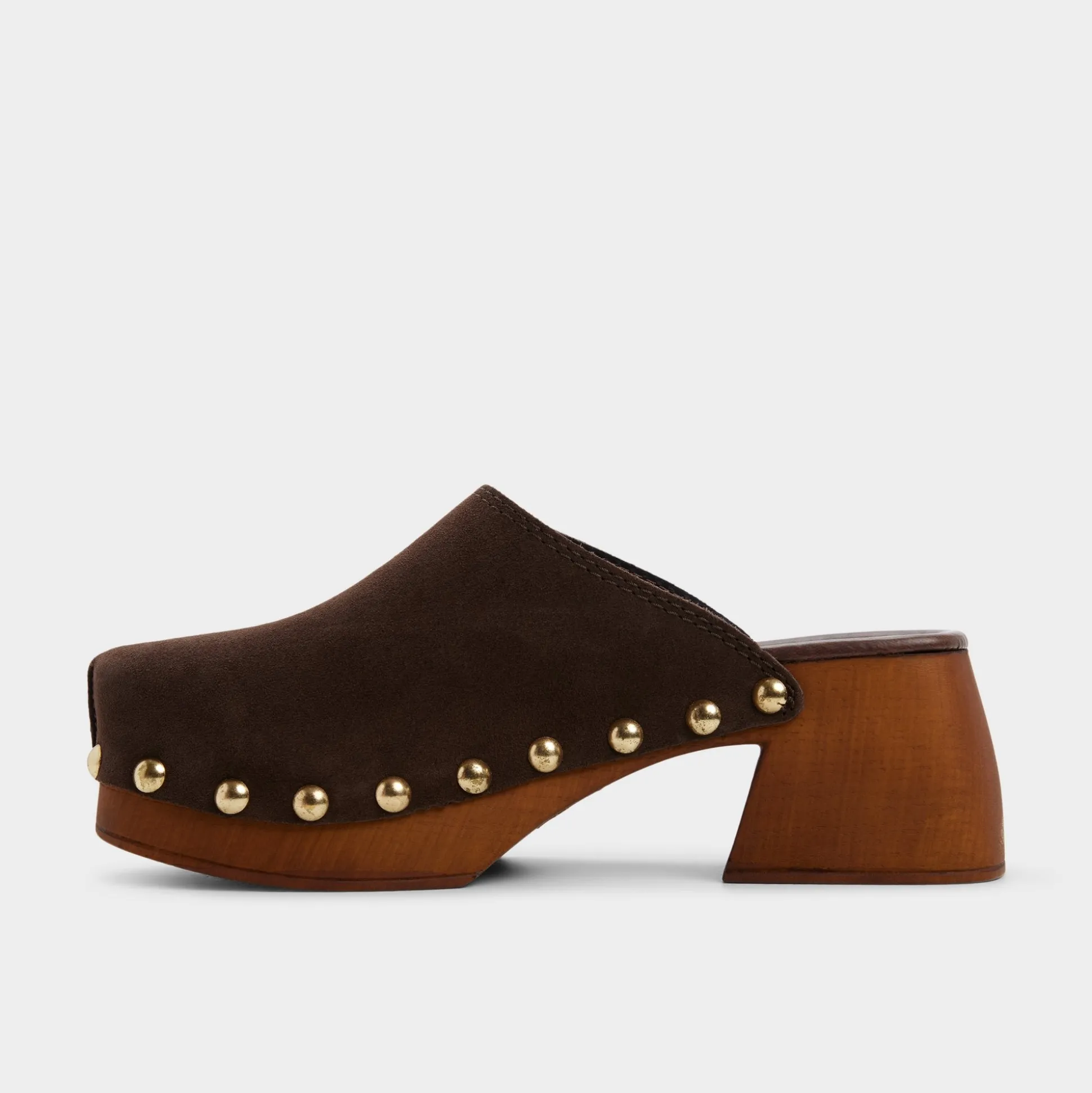 Glossy gold studs trace the edge of a wood clog heel, pairing rich suede with cushioned insoles to create an easy-slide attitude that’s confident from morning errands to after-hours gallery hops. Pair with flared denim for market mornings, or anchor satin midis when gallery openings roll into wine-bar afterhours.