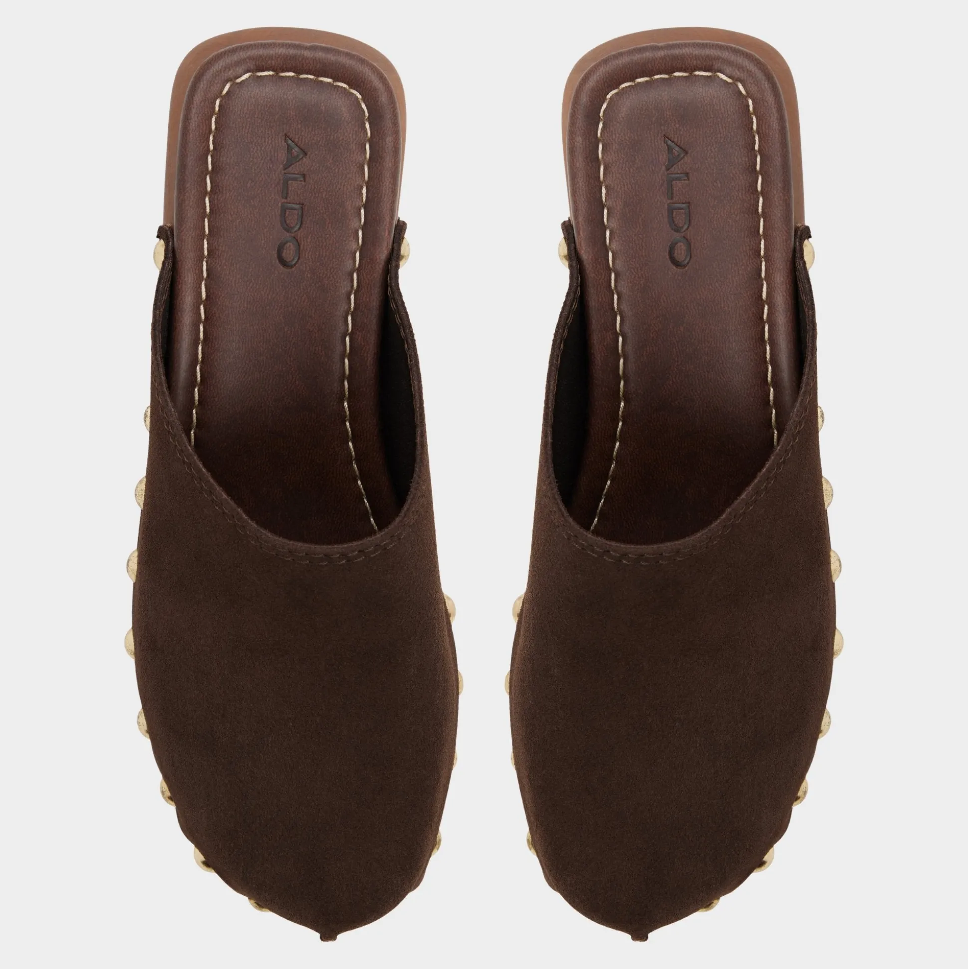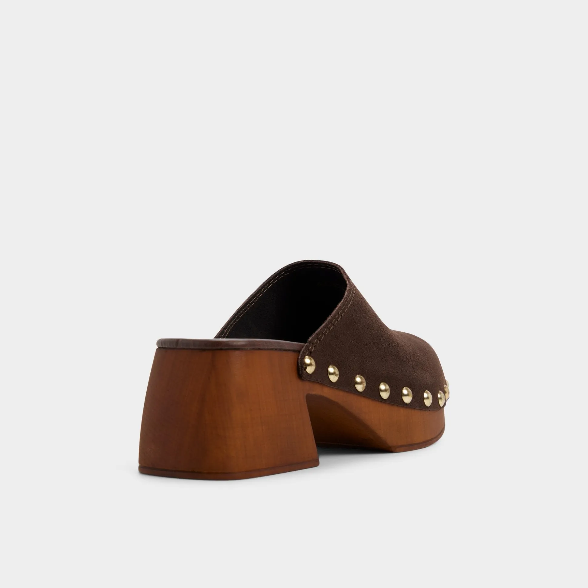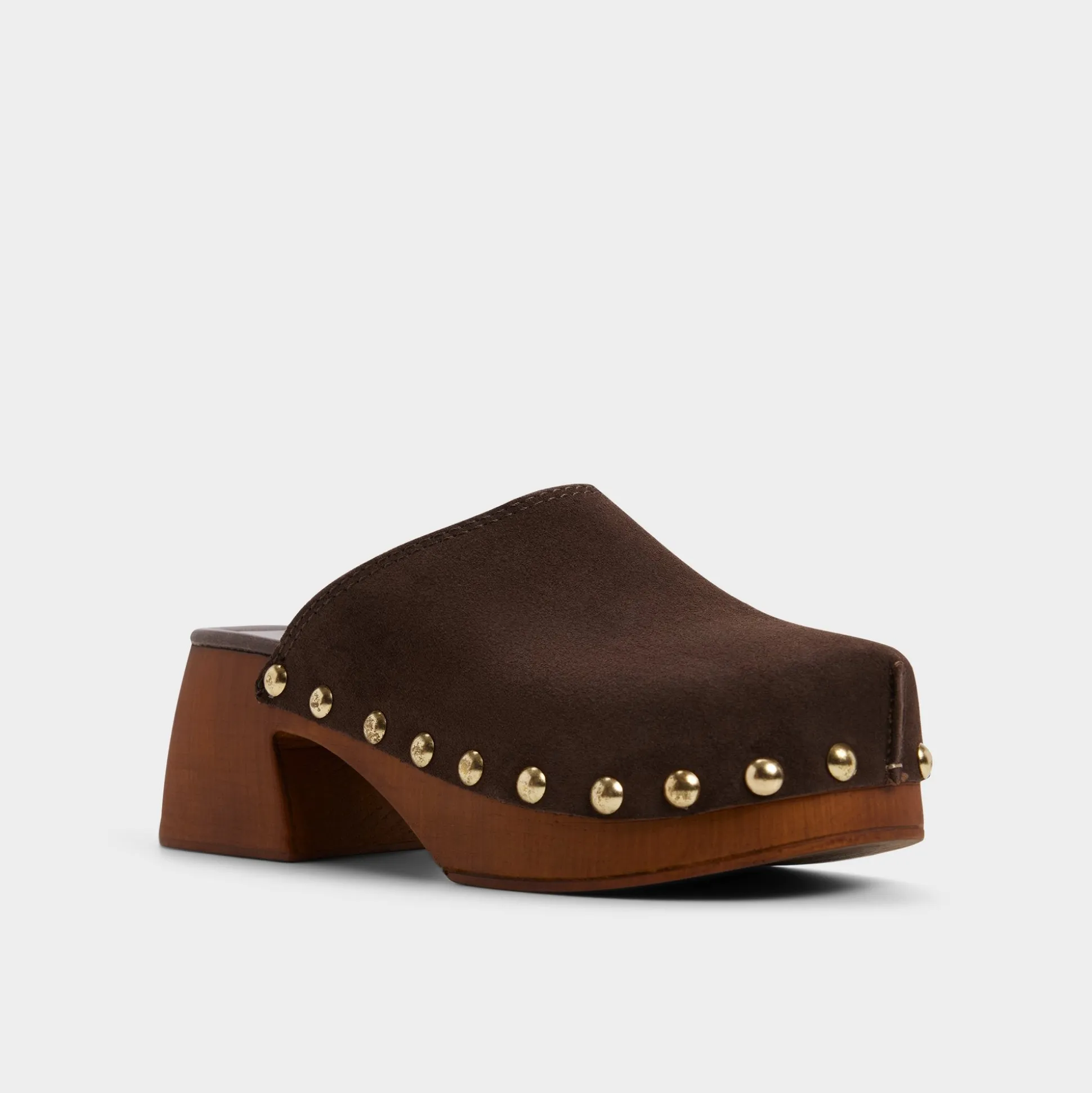 Glossy gold studs trace the edge of a wood clog heel, pairing rich suede with cushioned insoles to create an easy-slide attitude that’s confident from morning errands to after-hours gallery hops. Pair with flared denim for market mornings, or anchor satin midis when gallery openings roll into wine-bar afterhours.