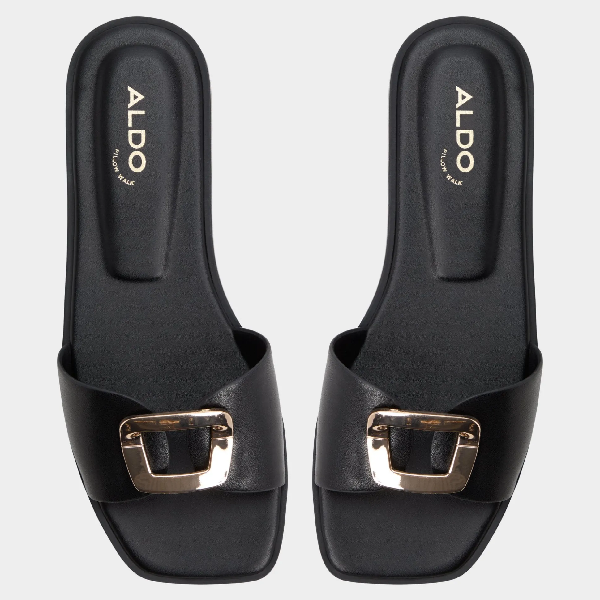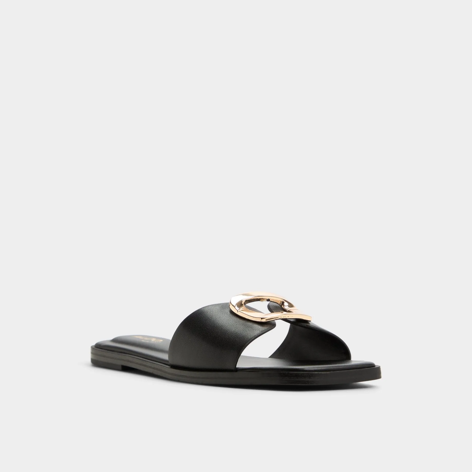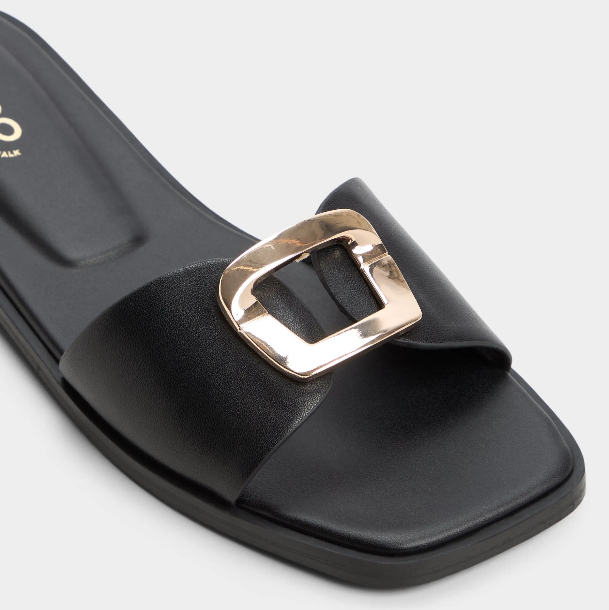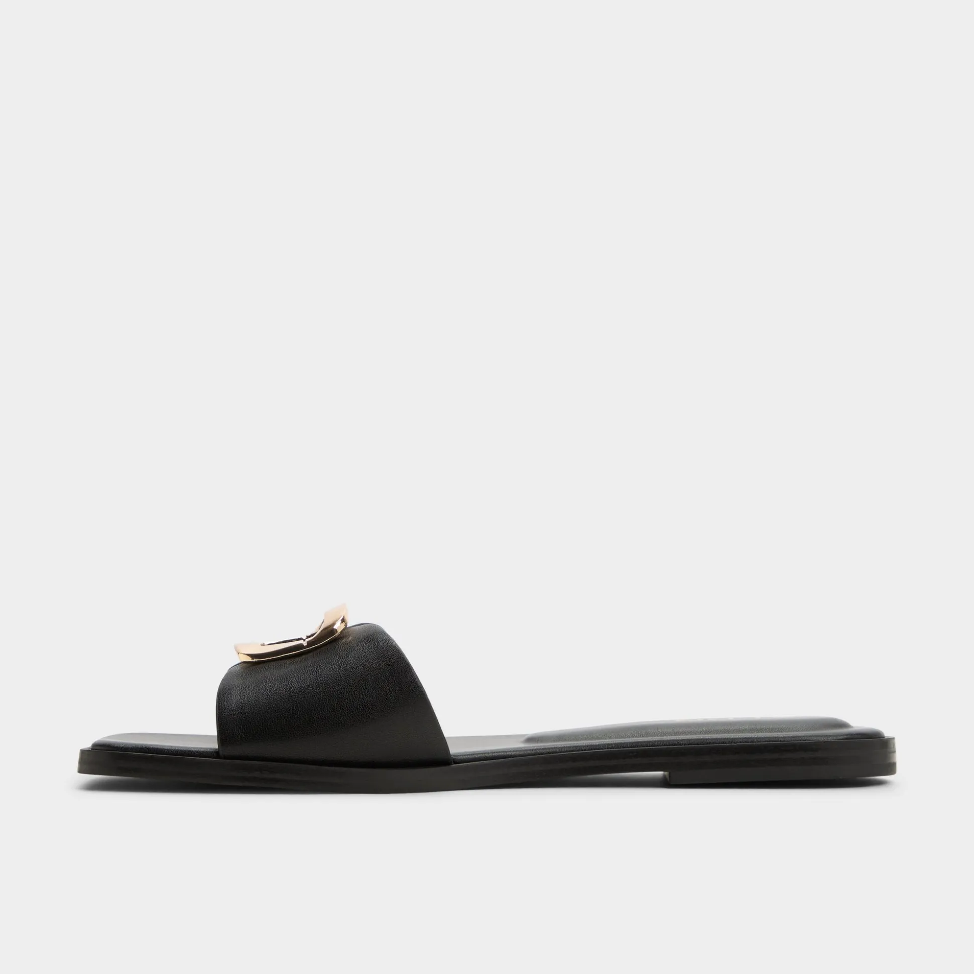 Supple black leather hugs the foot with a clean single strap, a gleaming buckle catching light as a padded square footbed steadies every step from busy elevators to late-night strolls. Pair with cropped linen trousers for brunch, or style it under a sleek slip dress for rooftop cocktails.