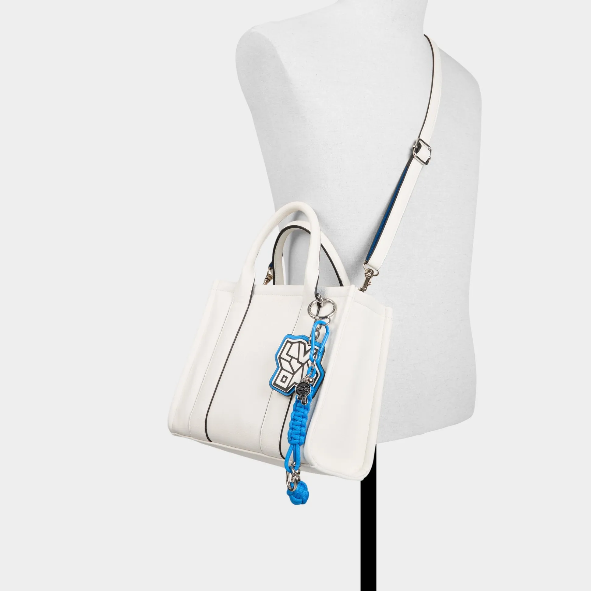 Clean-cut white leather with racer-black piping gives this mini tote modern edge, while a clip-off electric-blue paracord charm adds a playful pop to the open-top silhouette that’s made for quick grabs on the move. Carry it with an oversized linen blazer for coffee meetings or tuck next to denim cut-offs for festival days, finishing looks with crisp confidence.