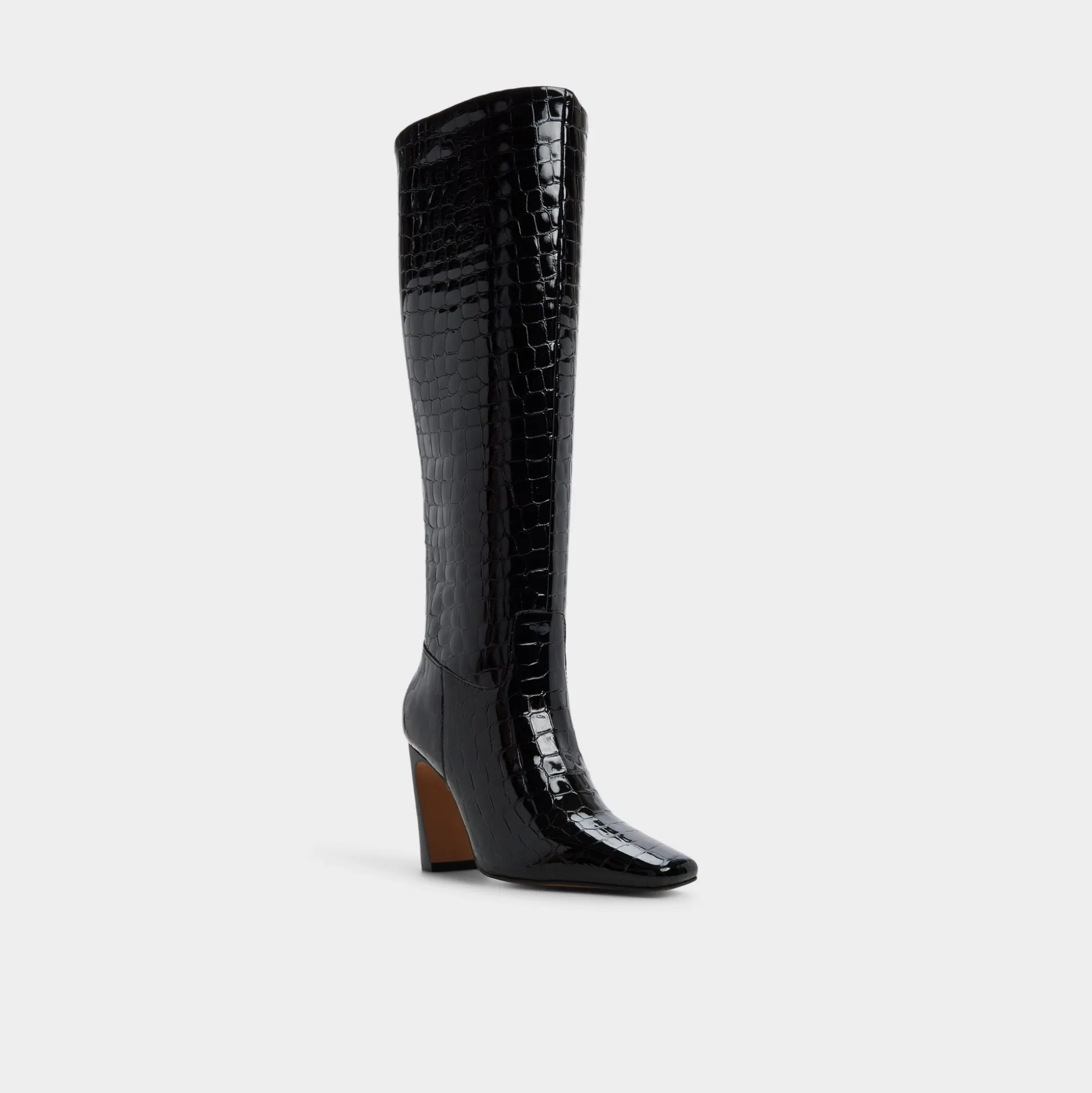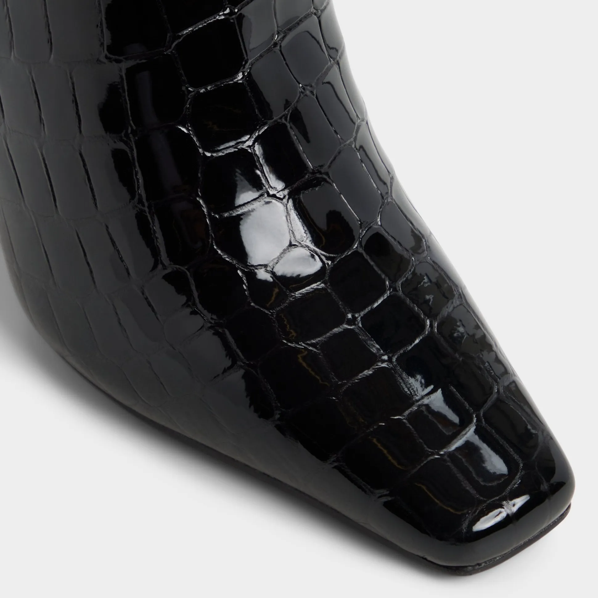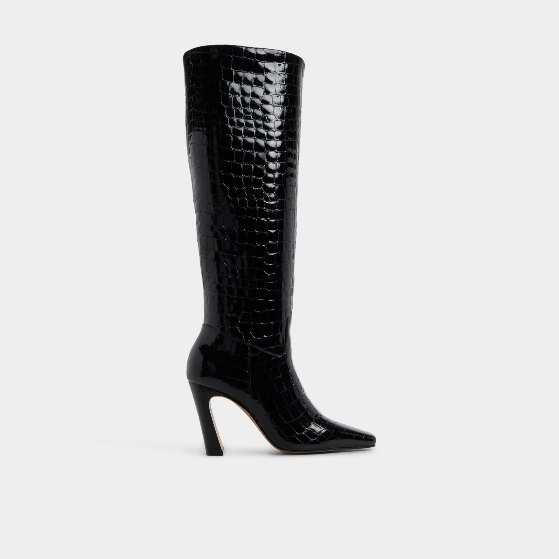 High-gloss croc-embossed patent leather wraps this knee-high boot in after-dark attitude, with a sharp pointy toe and slender stiletto amplifying every step, while a cushioned insole quietly keeps the pace. Pair with a chunky knit mini for brunch that turns into live music, or ground sleek leather leggings during midnight rooftop views.