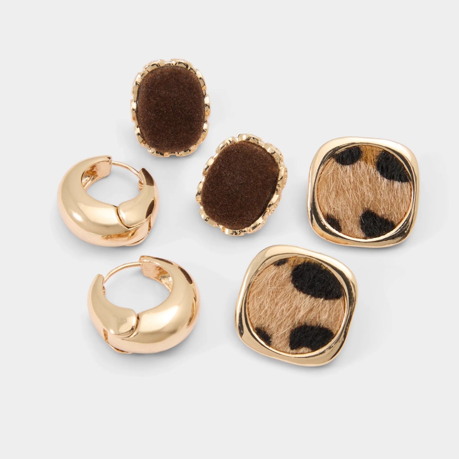 Leopard-print calf-hair studs pair with ovals and polished huggie hoops in a three-pair set that adds texture and a subtle gleam to city-ready looks. Swap or stack them to dress satin slips for dinners or finish bomber jackets with jeans during laid-back errands.